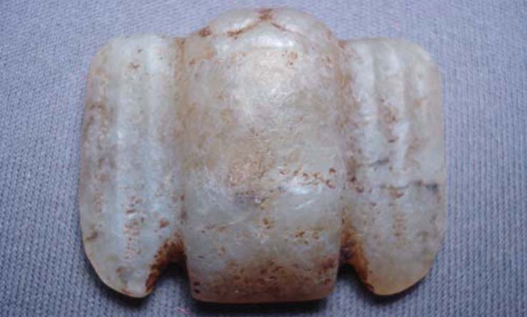 4.红山玉中石英质玉的存量更大。在矿区几乎随处可见。石英质玉主要成分为SiO₂,是由粒状石英集合体组成的致密块体,石英含量在90%以上,另有少量铬云母、绢云母、锂云母、赤铁矿、蓝闪石等,为三方晶系,可呈细晶质、微晶质、隐晶质、显微隐晶质的粒状多晶体集合可呈团块状或者条带状。硬度达到6.5至7,质纯时,石英岩为白色,硬度为7,密度2.65左右,折射率约1.54,玻璃光泽。玉质优美,洁白清丽。因其质地致密细腻,颜色美观,硬变较高,高度、光泽佳,抛光性能好,并有一定的透明度,颇受爱玉人士欢迎。与新疆白玉、京白玉、密玉、贵翠、东陵石、天山白玉等当属于同一品种系列。石英质玉也是做为玻璃的制作材料之一。