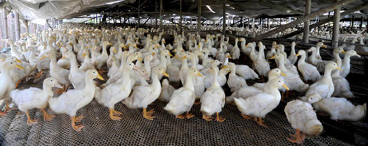 鸭舍空间可以充分利用,增加饲养密度,提高单位面积的产量。可采用机械化设备,减轻劳动强度。