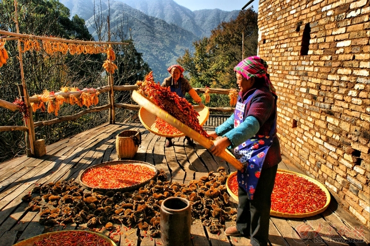 圆圆大大的山寨木楼和周边的凉亭、架棚以及专做的晒架,均被勤劳的晒秋人家或挂或摆,晒满了“满满的秋意”和满满的幸福,那一串串火红火红的是辣椒,那一垛子一垛子金黄金黄的是玉谷,那一嘟噜一嘟噜白胖白胖的是蒜头,那一盘盘暗红粒亮的是山枣,那一篾筐一篾筐褐色长长的是山蕨、灰白片片的是茄干、粉白粉白的是葛粉、橙红透亮的是山柿、褐褐圆圆的是板栗、褐黄嫩绿的是黄花、褐黑如伞的是香菇、黑褐黑褐的是木耳……